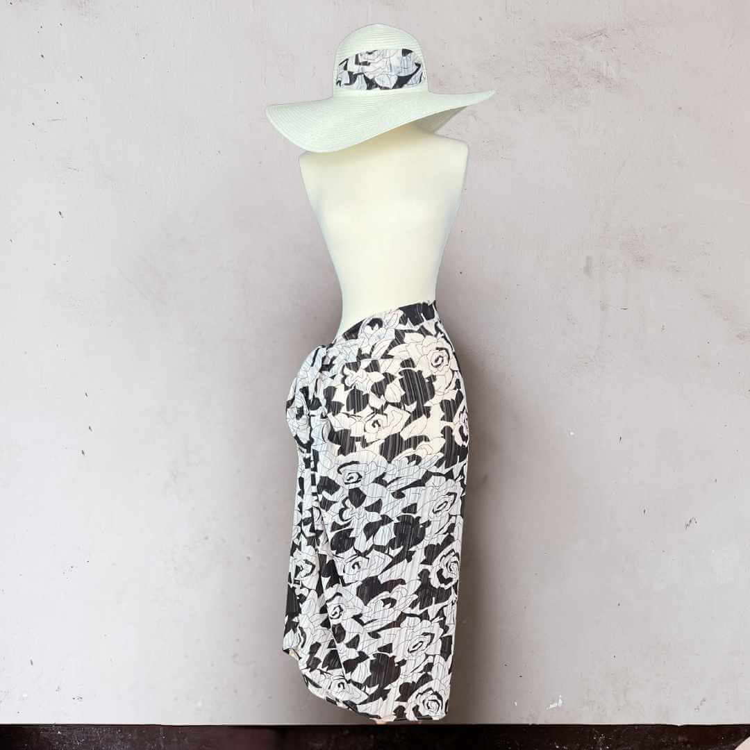 Minimaliste et chic, le pack Chill vous enveloppe de style en noir et blanc. Le paréo aux motifs floraux graphiques offre un contraste saisissant, tandis que le chapeau capeline noir, orné d’un ruban en tissu assorti, complète la tenue avec élégance.