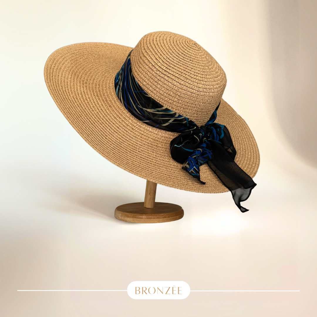 Le Pack Dune allie la chaleur du sable au mystère des nuits étoilées. Son paréo noir orné de lignes dorées et bleutées se marie à une capeline naturelle soulignée d’un ruban assorti, pour une allure à la fois sobre et sophistiquée.