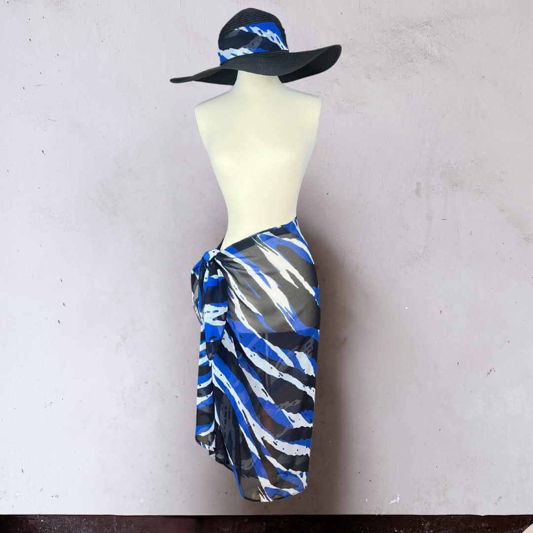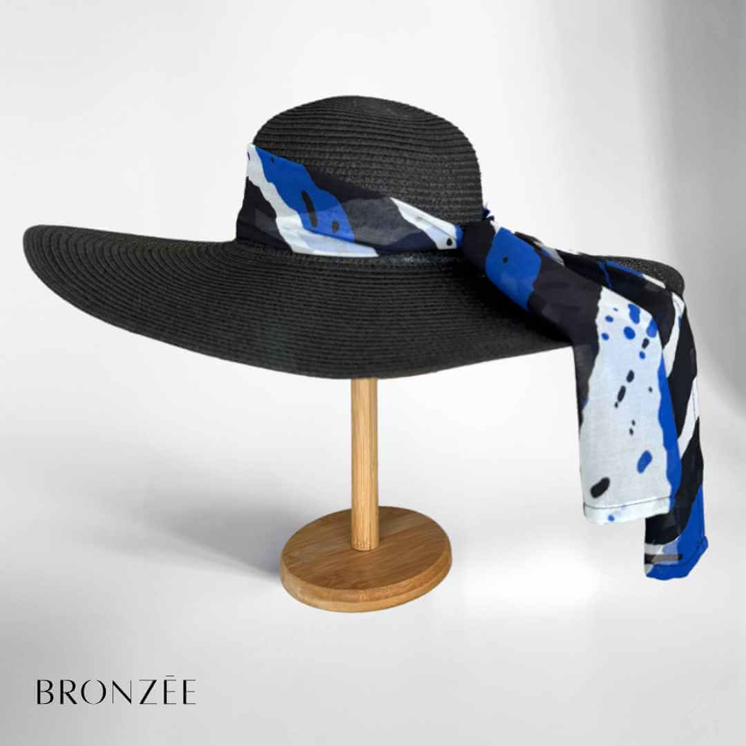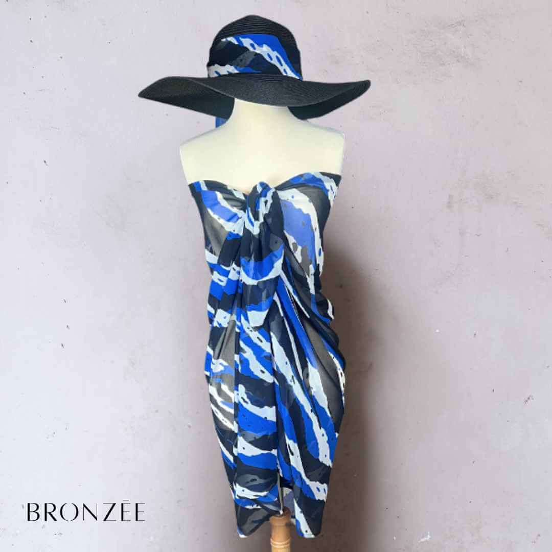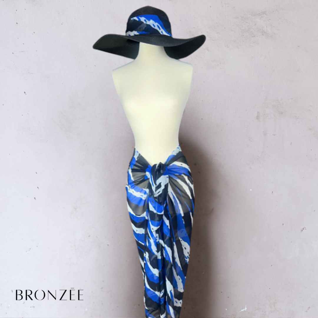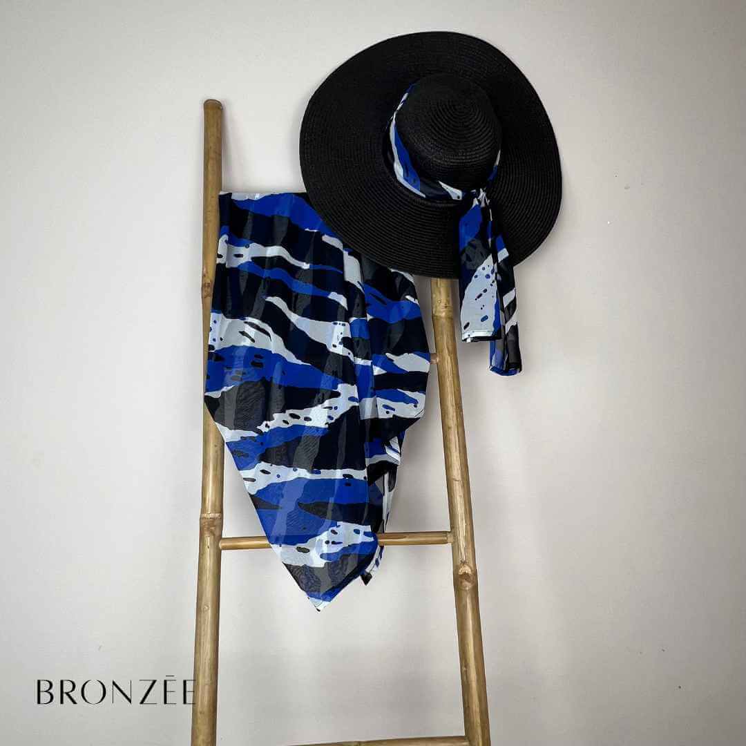 Découvrez le pack Maya, l’alliance parfaite entre élégance graphique et protection estivale. Avec ses motifs puissants en bleu, noir et blanc, le paréo Maya sublime chaque silhouette, tandis que le chapeau capeline noir, habillé d’un ruban assorti, apporte la touche finale à votre allure.